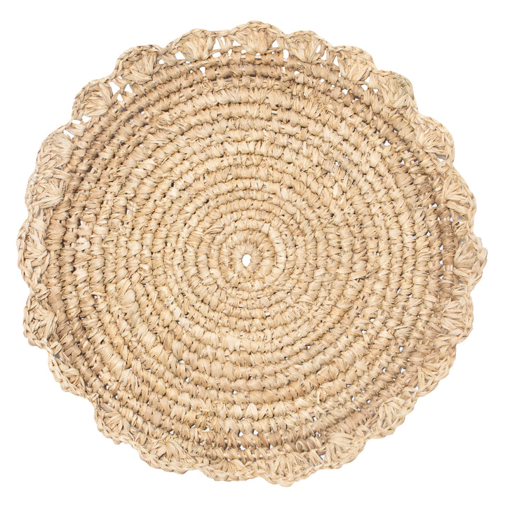 Pairs well with any spread, yet varied enough to show off that natural fiber. Features a delicate floral lace weave all around the border. A perfect choice for everyday use and casual entertaining. 15” Round placemats - Handwoven from Natural Raffia - Varied fibers show off natural character - Each piece will vary slightly in size and color